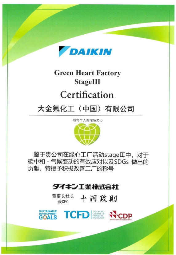 大金氟化工(中国)有限公司的绿色之心工厂金级证书